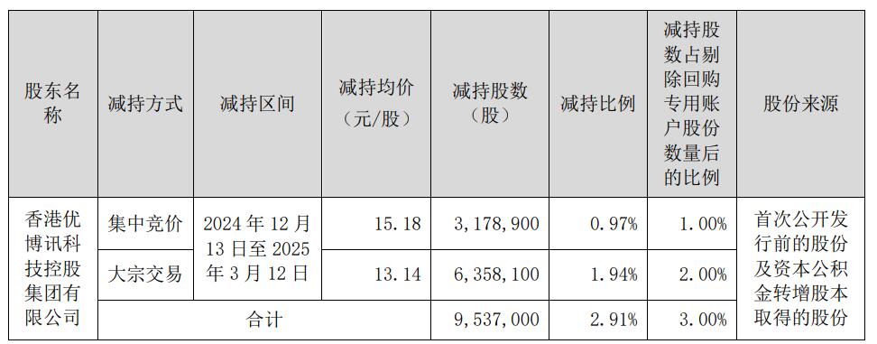 UBX(300531.SZ)最近宣布的调查和股东转让计划的中国经济网络北京的中国经济网络是,打算参与调查和转让的股东是公司的控制者,香港Ubxun Technology Group.,Ltd。 Transferr转让的股票总数为9,537,330股,占公司总股本的2.96%,在排除了我们的特殊帐户行动的新披露的股票数量之后,占公司总股票总资本的3.00%。转移器将依靠CICC此咨询转移来组织和实施。这个inavelo的受让人是公司的控制股东Youoxun Holdings,其拥有超过5%公司的股份。 Uboxun Holdings,Guo Song,Chen Yihan,Liu Dan和深圳Botong Sichuang Consulting Co.,Ltd。是共同演员。 2025年3月13日,Uboxun宣布了其股份减少计划股东的管理结束时的广告。从2024年12月13日至2025年3月12日,控制股东尤奥克斯·控股公司(Ouxun Holdings)的股票减少了9,537,000股。其中,由于浓缩要约,减少了3,178,900次措施,导致平均每行动减少15.18元。大量交易减少了6,358,100股,平均每股平均减少13.14元。计算后,Uboxun Holdings达到了1.32亿元。 Ubxun的真正控制器是Guo Song,Chen Yihan和Liu Dan,所有这些都是新加坡国籍。在2023年和2024年,Uboxun分别在贸易公司的股东中获得了净利润,分别为1.67亿元和-1.5亿元。同伴股东产生的净收入IES在扣除非重建的利润和损失后引用的IES分别为-17000。那是1,000元和-14亿元人民币。